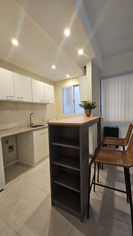 Cocina integrada por barra desayunadora y ventilación natural, conexión para lavarropas, alacenas y bajo mesada a medida nuevos. Sector de dormitorio con división, amplio placard a estrenar y ventana a la calle. Distribuidor con placard. Baño con vanitory, ducha con mampara de vidrio y ventilación natural. Calefacción por tiro balanceado. La unidad fue reciclada en su totalidad: instalaciones de luz, gas, agua, cloacales, pisos, baño y cocina. Se entrega equipado a estrenar como se ve en las fotos. Escribania designada.